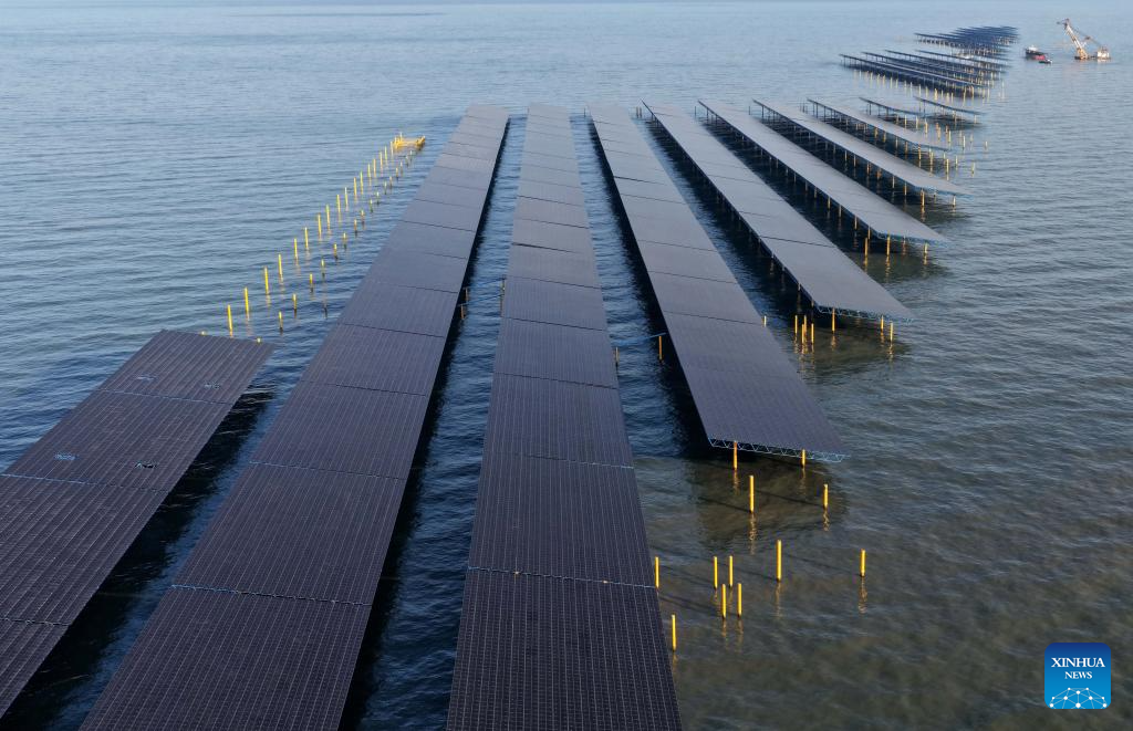 A drone photo taken on Dec. 24, 2025 shows solar panels at an offshore photovoltaic power station in waters off Changli County, north China’s Hebei Province. (Xinhua/Yang Shiyao)