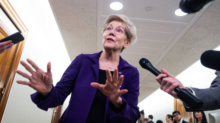 Ranking member Sen. Elizabeth Warren, D-Mass., talks with the media before Treasury Secretary Scott Bessent testified during the Senate Banking, Housing and Urban Affairs Committee hearing titled “The Financial Stability Oversight Council’s Annual Report to Congress,” in Dirksen building on Thursday, Feb. 5, 2026.