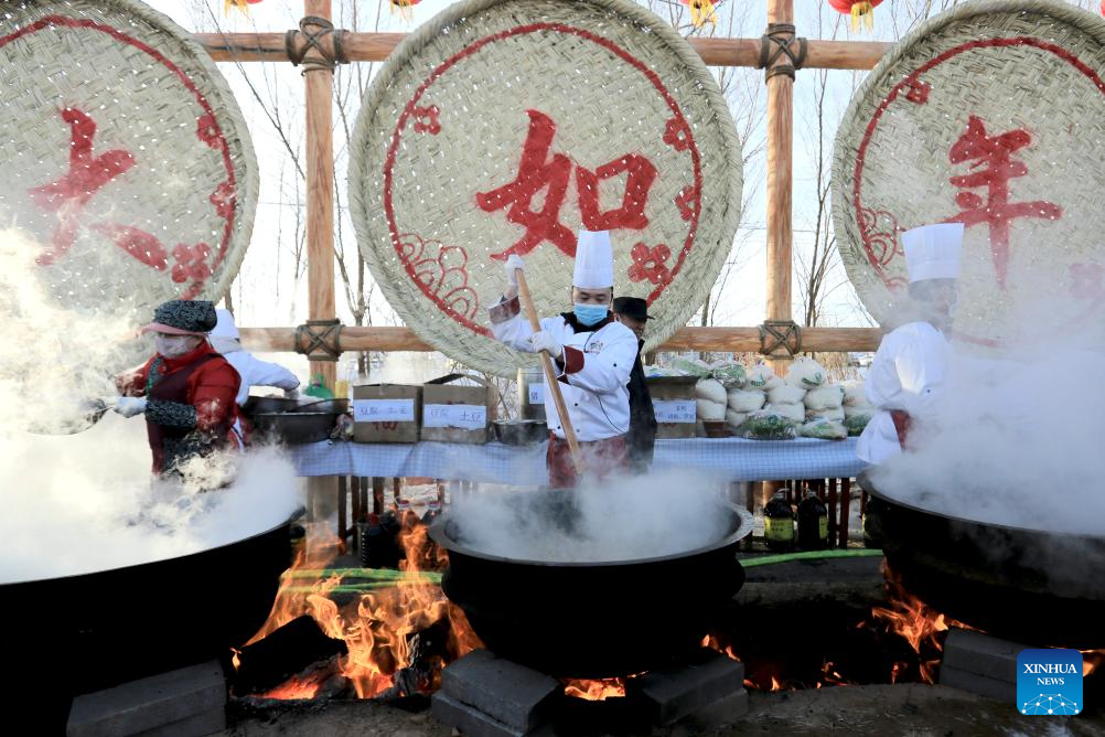 This photo taken on Dec. 21, 2025 shows chefs cooking special food on Winter Solstice in Qidian Village, Zhangye City of northwest China’s Gansu Province.
