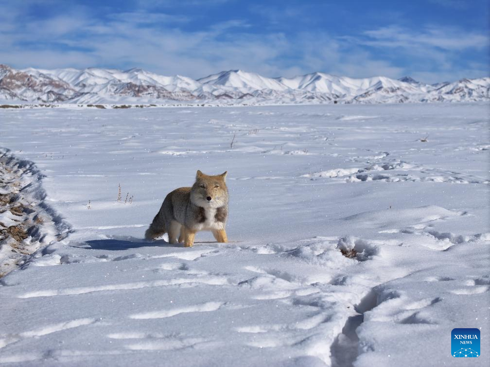A drone photo taken on Dec. 31, 2025 shows a Tibetan fox walking on a snow-covered grassland in Kazak Autonomous County of Aksay, Jiuquan City of northwest China’s Gansu Province.