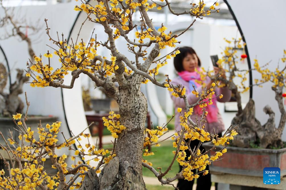 This photo taken on Jan. 1, 2026 shows a visitor taking photos of wintersweet at a garden in Yanling County, Xuchang City of central China’s Henan Province.