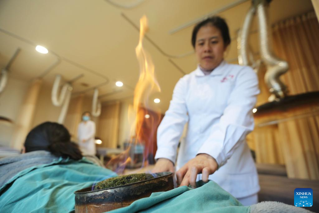 This photo taken on Jan. 8, 2026 shows a doctor giving moxibustion treatment for a patient at a traditional Chinese medicine hospital in Dingxi City, northwest China’s Gansu Province.