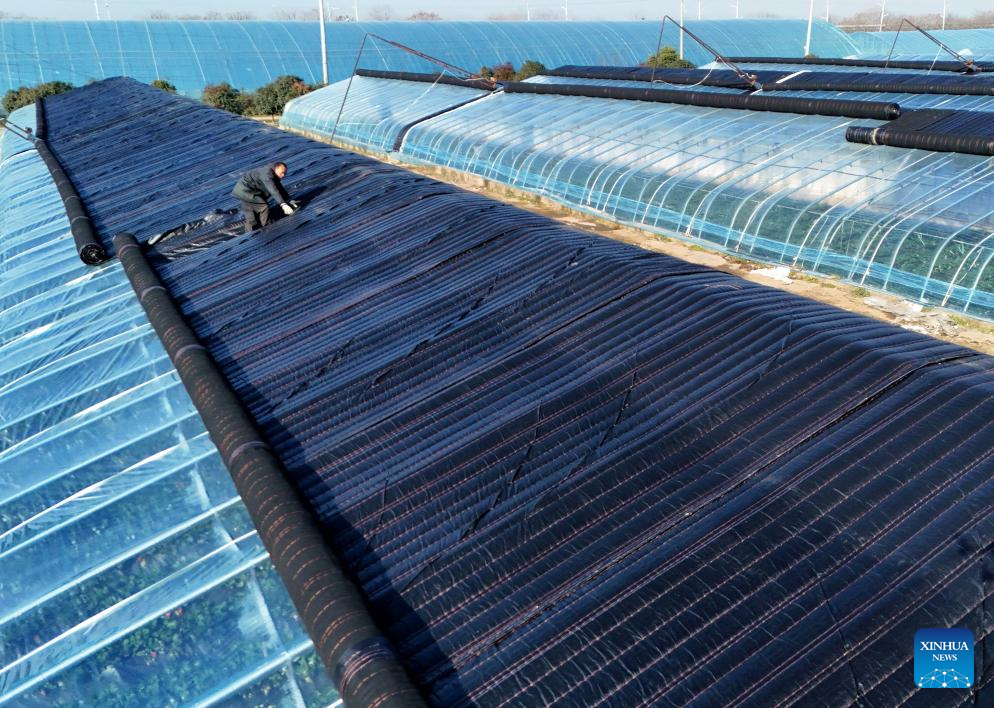 A drone photo taken on Jan. 7, 2026 shows a worker covering greenhouses with films to keep them warm at a vegetable planting base in Lidian Town, Nanyang City of central China’s Henan Province.
