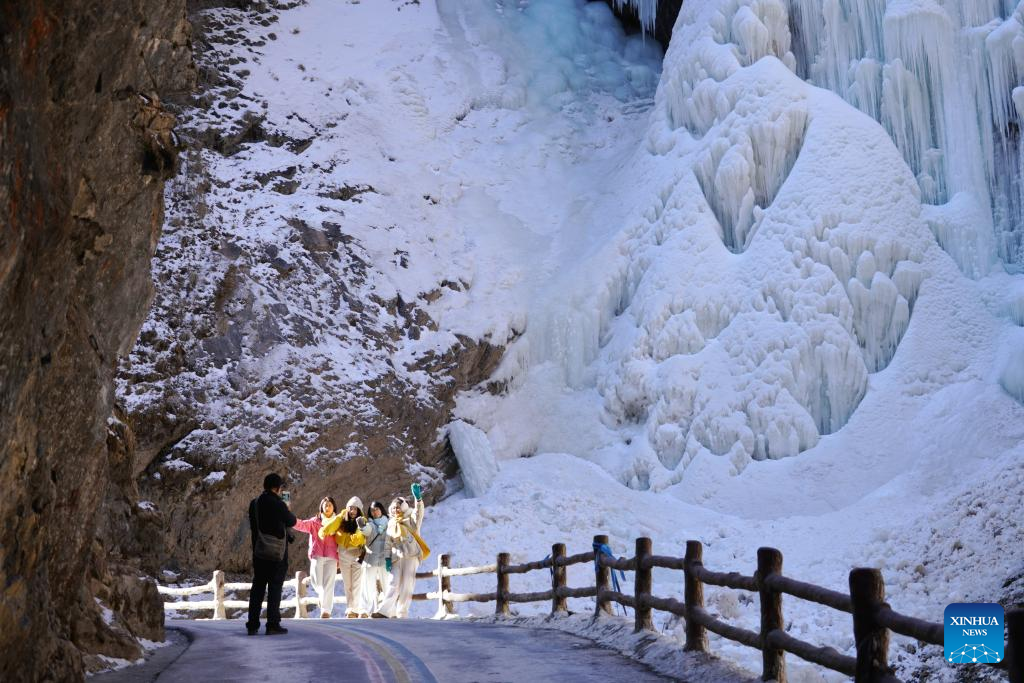People pose for photos with ice cascade in the backdrop at Guan’egou scenic spot in Dangchang County, northwest China’s Gansu Province, Jan. 9, 2026.