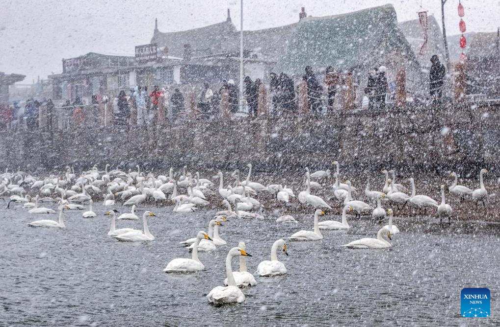 A drone photo taken on Jan. 10, 2026 shows visitors watching whooper swans in snowfall in Yandunjiao Village, Rongcheng City of east China’s Shandong Province.