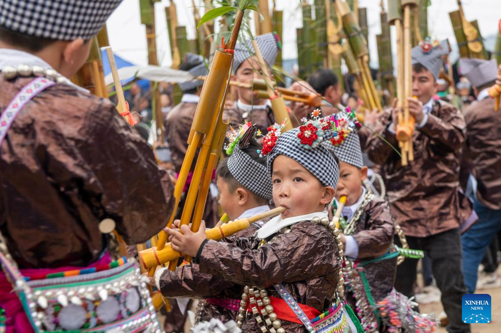 This photo taken on Dec. 21, 2025 shows children of Miao ethnic group playing Lusheng, a traditional reed-pipe wind instrument, during a Lusheng festival on Winter Solstice in Dadong Village, Congjiang County of southwest China’s Guizhou Province.