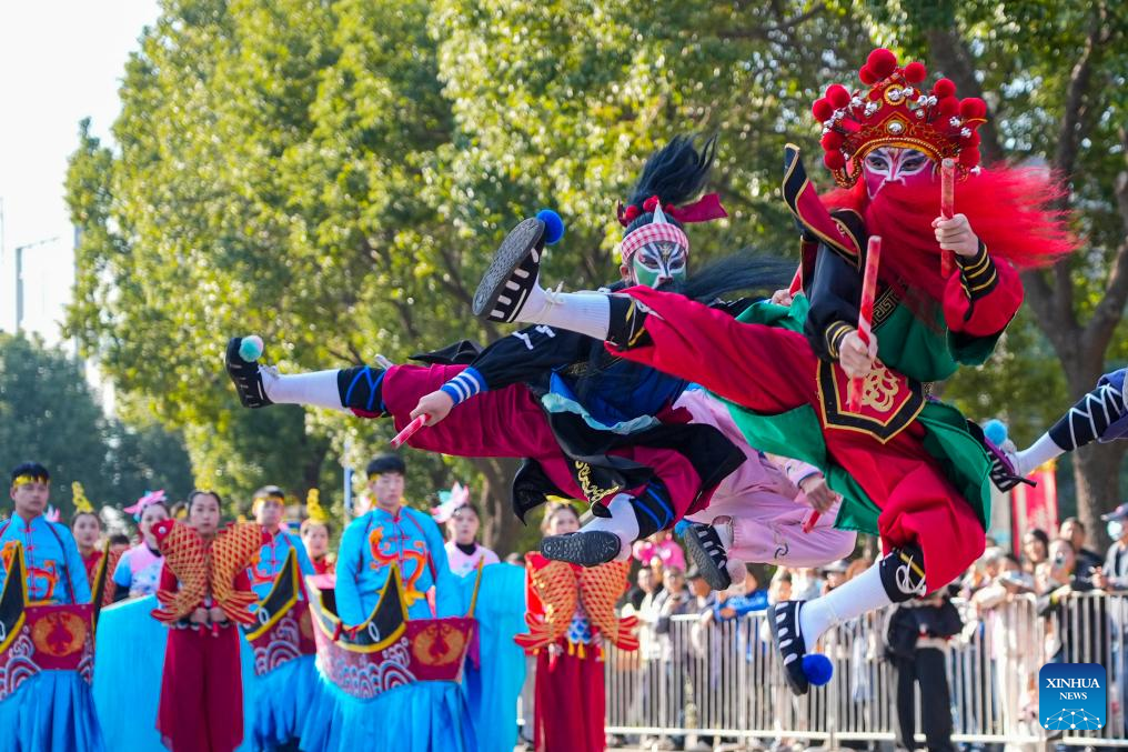 This photo taken on Dec. 20, 2025 shows folk artists performing Yingge Dance during a cultural parade in Xiepu Town, Ningbo City of east China’s Zhejiang Province.