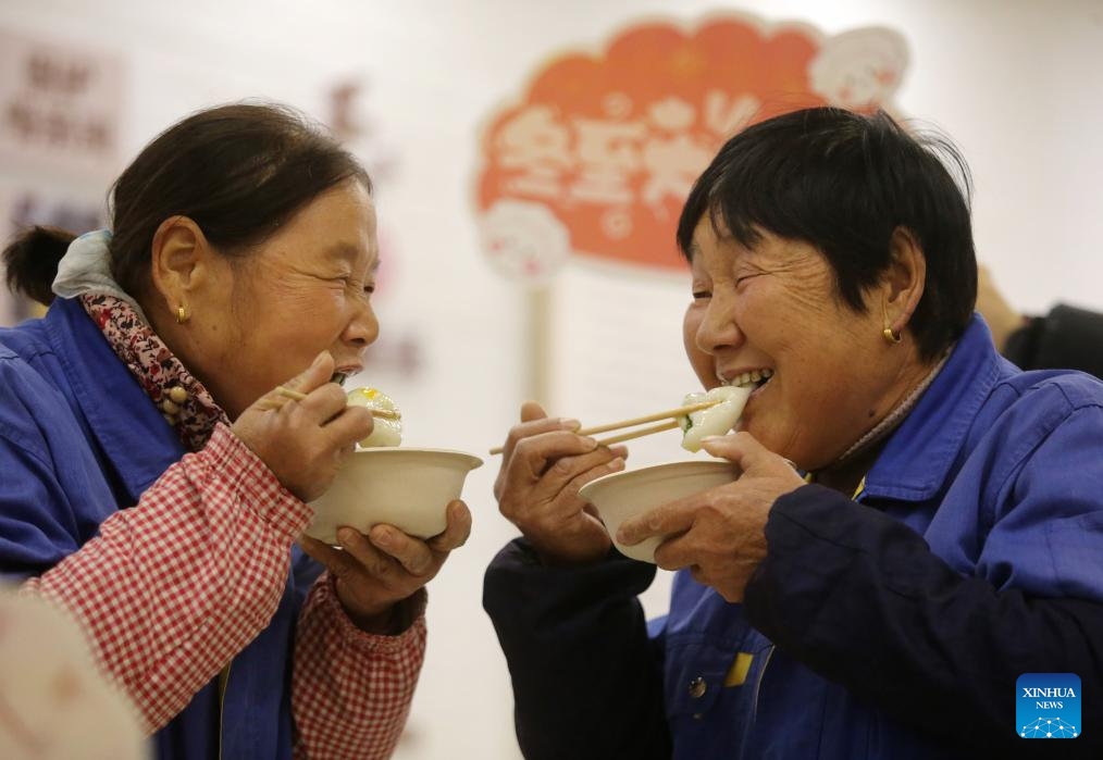 This photo taken on Dec. 21, 2025 shows sanitation workers eating rice dumplings during a welfare event on Winter Solstice in Yangzhou City, east China’s Jiangsu Province.