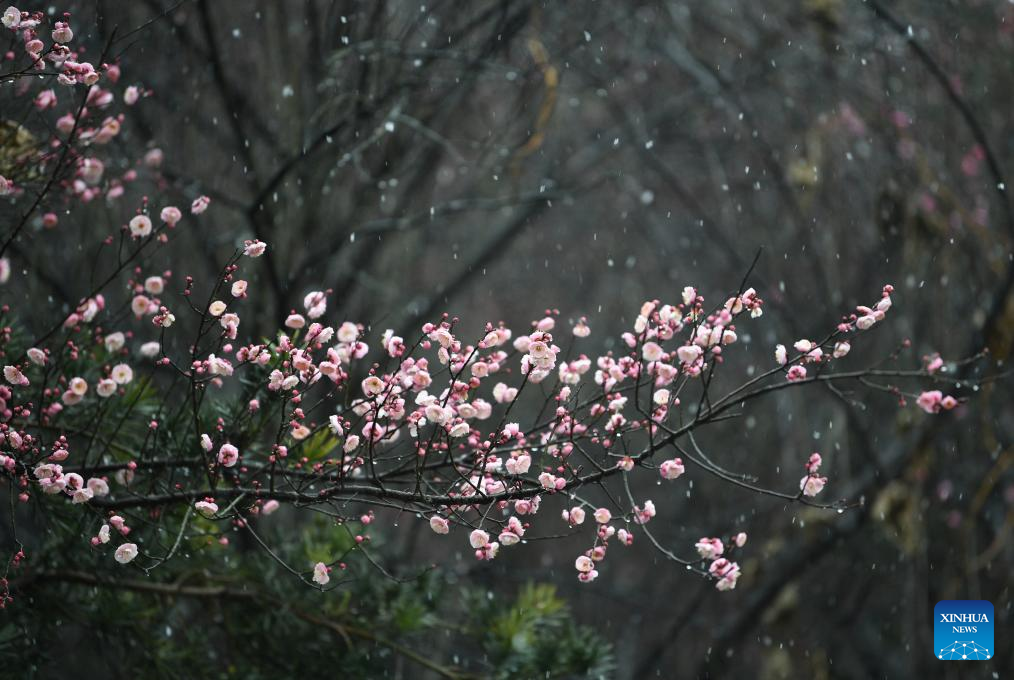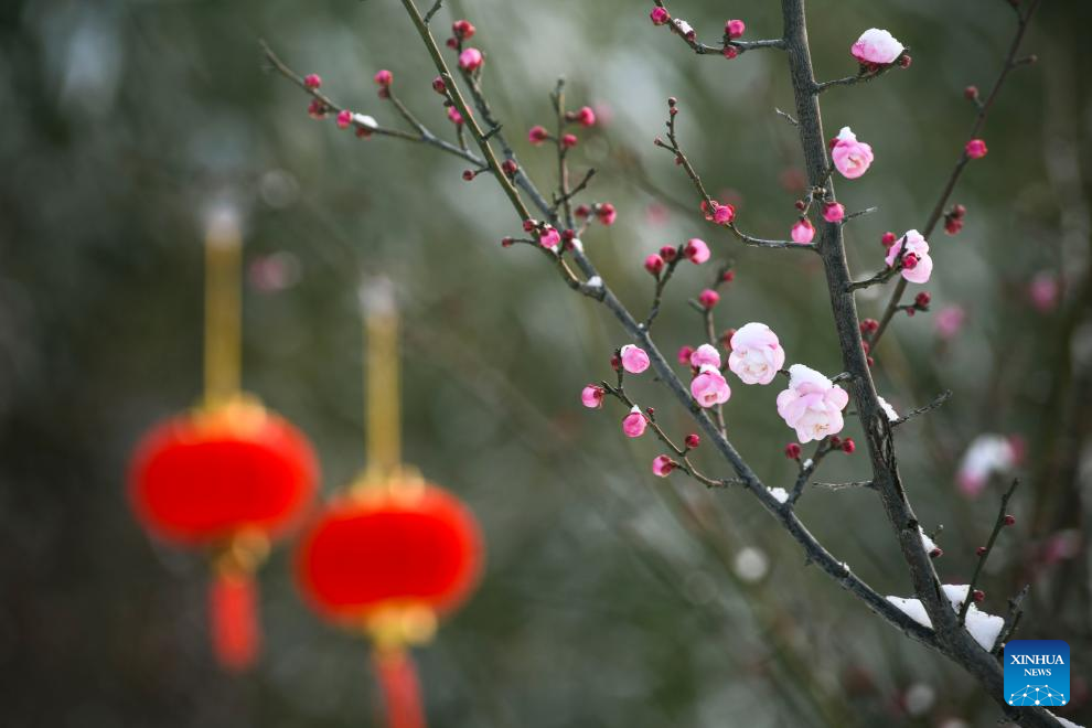 This photo taken on Jan. 1, 2026 shows plum flowers after a snowfall at a plum garden in Huashi Village, Jiyuan City of central China’s Henan Province.