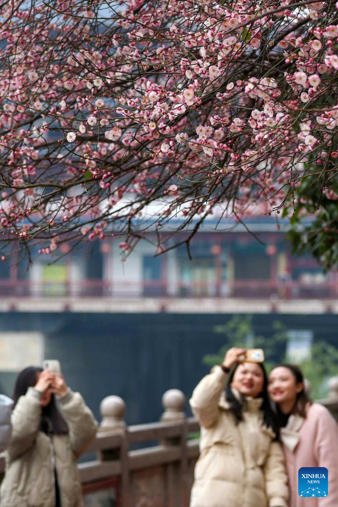 This photo taken on Jan. 5, 2026 shows people taking photos of plum flowers in Yuping Dong Autonomous County, Tongren City of southwest China’s Guizhou Province.