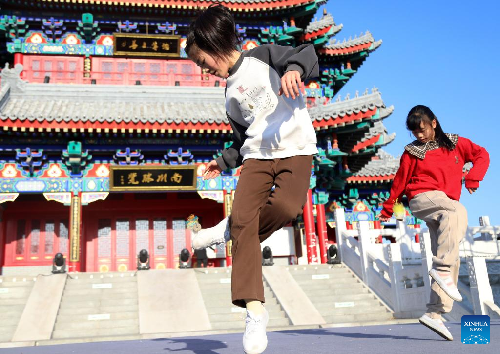 This photo taken on Dec. 21, 2025 shows children playing shuttlecock during a competition on an ancient street on Winter Solstice in Cangzhou City, north China’s Hebei Province.