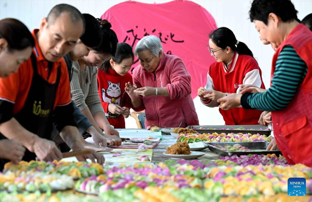 This photo taken on Dec. 21, 2025 shows community volunteers and elders making dumplings at an elder apartment on Winter Solstice in Shijiazhuang City, north China’s Hebei Province.