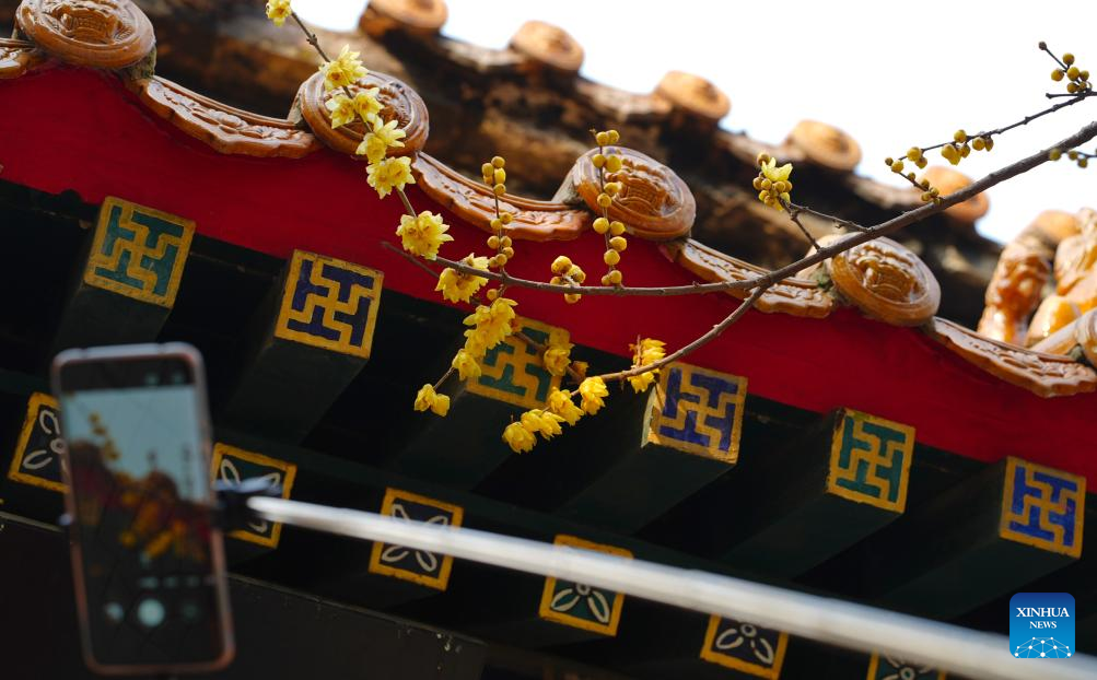 This photo taken on Jan. 5, 2026 shows a visitor taking photos of wintersweet at an ancient courtyard in Shijiazhuang City, north China’s Hebei Province.