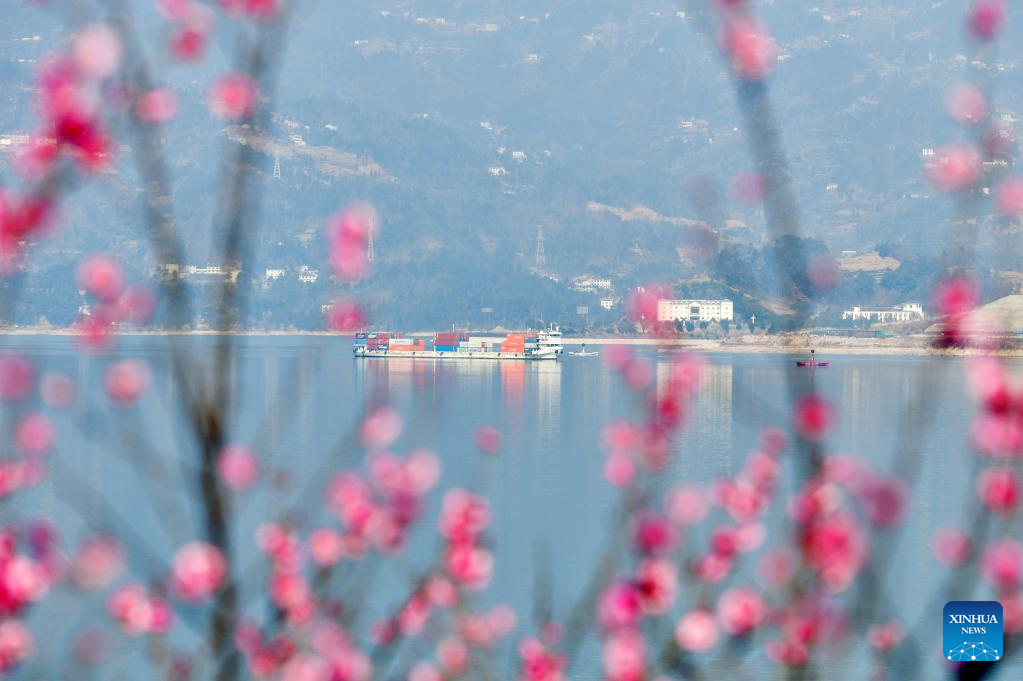 This photo taken on Jan. 11, 2026 shows plum flowers seen on a bank of Taiping creek in Yichang City, central China’s Hubei Province.