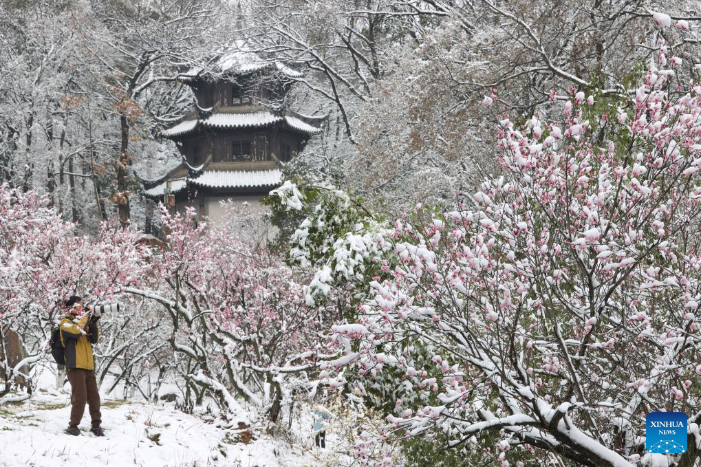 This photo taken on Jan. 1, 2026 shows a visitor taking photos of plum flowers after snowfall at Gulongzhong scenic spot in Xiangyang, central China’s Hubei Province.
