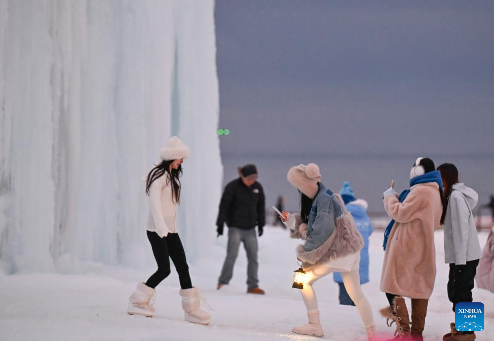 Tourists have fun on the frozen surface of the Sayram Lake in Bortala Mongolian Autonomous Prefecture, northwest China’s Xinjiang Uygur Autonomous Region, Dec. 16, 2025. (Photo by Xu Rui/Xinhua)