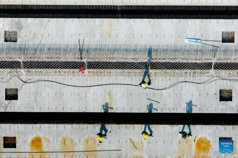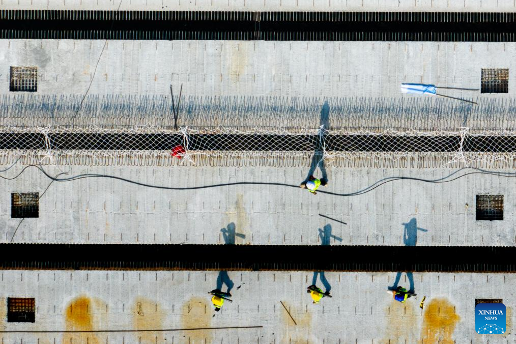 Constructors work at the construction site of a highway in Wuhan, central China’s Hubei Province, Oct. 6, 2025. Many workers have been standing fast at their posts and fulfilling their duties during the eight-day National Day and Mid-Autumn Festival holiday. (Xinhua/Xiao Yijiu)