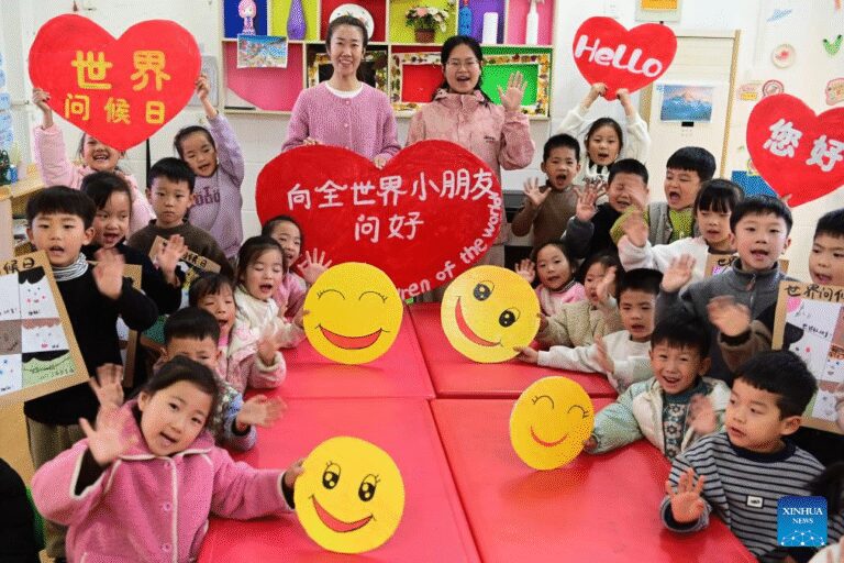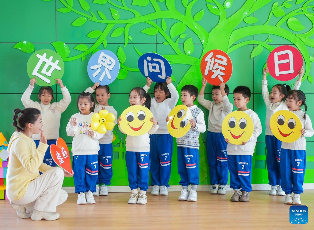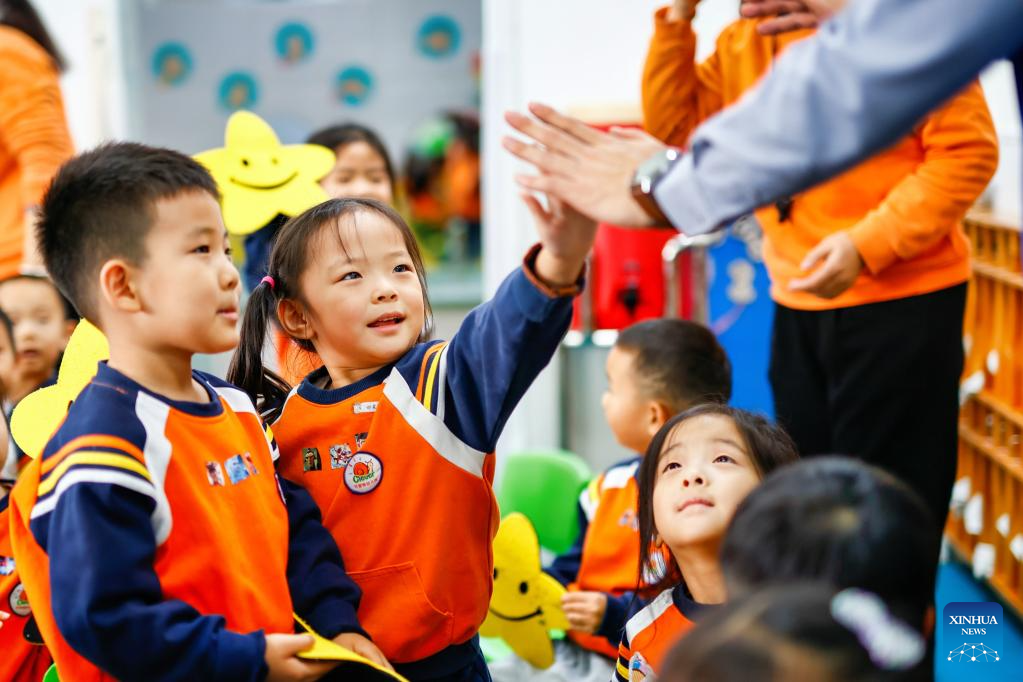 A teacher and children greet each other to celebrate the upcoming World Hello Day, which falls on Nov. 21 annually, at a kindergarten in Shijiazhuang, north China’s Hebei Province, Nov. 20, 2025. (Photo by Chen Qibao/Xinhua)