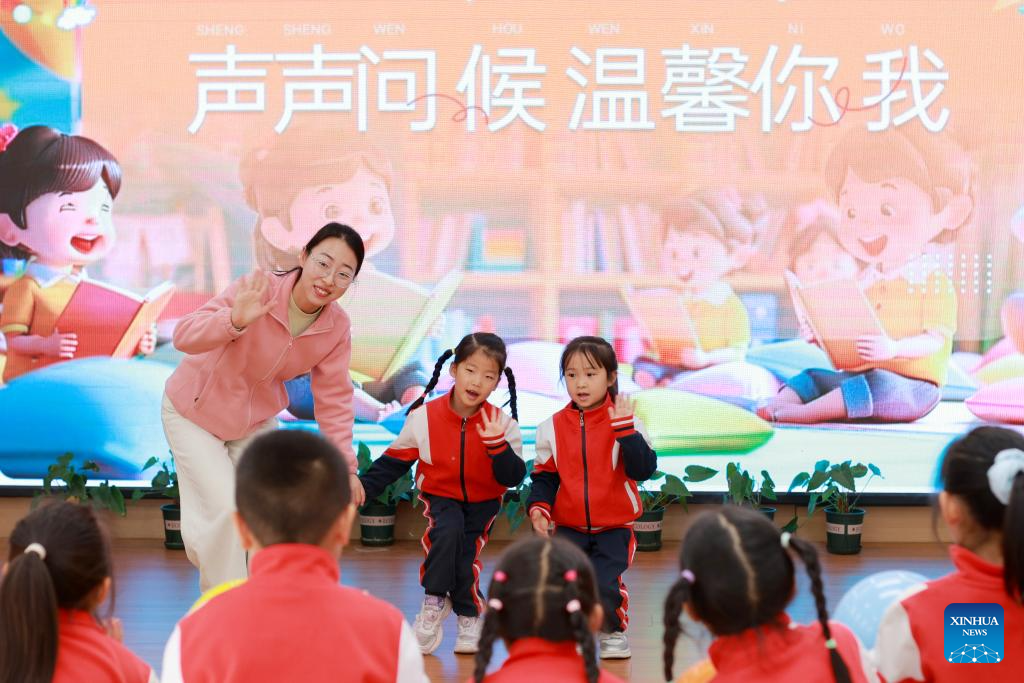 A teacher teaches children greeting etiquette to celebrate the upcoming World Hello Day, which falls on Nov. 21 annually, at a primary school in Wuhan, central China’s Hubei Province, Nov. 20, 2025. (Photo by Zhao Jun/Xinhua)