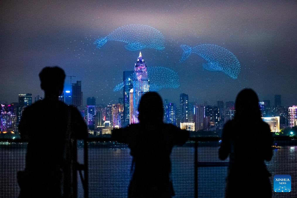 People view a drone performance during the opening ceremony of the 2025 Yangtze River cultural and arts season in Wuhan, central China’s Hubei Province, Sept. 12, 2025. The opening ceremony of the 2025 Yangtze River cultural and arts season was held in Wuhan on Friday. The event will run from Sept. 12 to Oct. 30, featuring a range of activities including art exhibitions, film week, and music week. (Xinhua/Wu Zhizun)